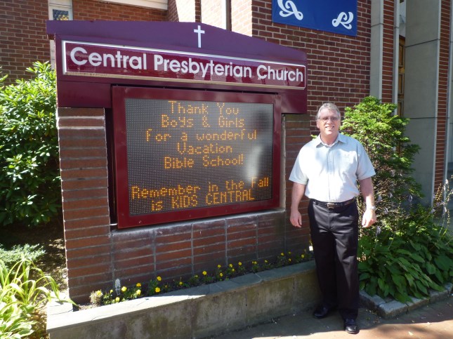 Ken in front of Central’s new sign.